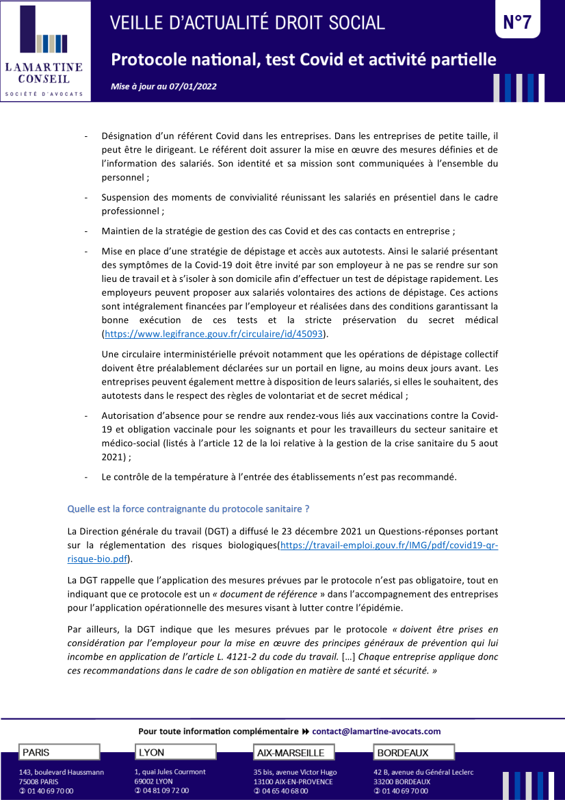 VEILLE ACTUALITÉ SOCIALE N°7 : Protocole national - test Covid - Activité partielle